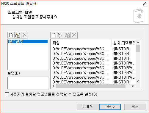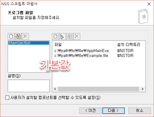 기본값은 아래 그림과 같습니다. 왼쪽 설치 그룹의 이름을 'MainSection'에서 '필수설치'로 바꾸고, 오른쪽의 파일 두 개는 지우고 제일 위에서 말씀드린 그 프로그램 파일들을 추가하였습니다.