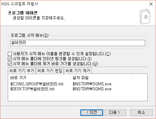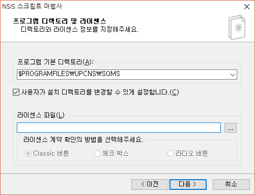 ① 프로그램 기본 디렉터리는 2-2에서 설정한 프로그램 이름으로 되어 있을 겁니다. 저 같은 경우 '$PROGRAMFILES\설비관리'로 되어 있더군요. 한글을 쓰기 싫어서 조금 수정했습니다. $PROGRAMFILES 인수는 아마도 설치할 컴퓨터의 프로그램 폴더를 뜻할 겁니다. 윈도우라면 대부분 'C:\Program Files' 이 경로를 뜻하죠. 저는 C:\Program Files\UPCNS\SQMS 에 설치가 되도록 했습니다.