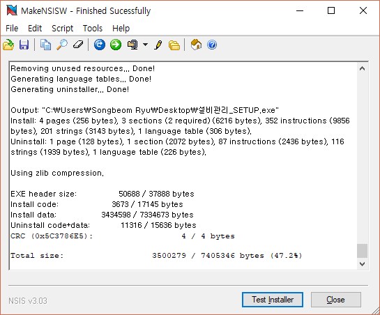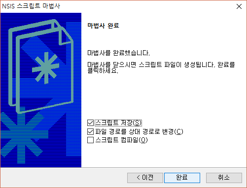 스크립트 마법사의 마지막 화면에서 스크립트 컴파일이라는 체크박스가 있는데요. 그 체크박스를 선택하게 되면 설치 파일까지 만들어 주는 것 같습니다. 굳이 NSIS를 따로 실행해서 스크립트를 로드 할 필요가 없을 것 같아요. 단지 한 가지 의문이 드는 건 HM NIS EDIT 단독으로 스크립트 컴파일을 진행하는 건지, 아니면 NSIS의 컴파일 기능을 빌려서 사용하는지 인데요. 단독으로 컴파일 진행한다고 하면 NSIS를 설치 할 필요가 없을테고요. 그게 아니라면 NSIS 설치까지는 해야 하는거고. 시간 들여서 테스트 해보면 되지만 귀찮습니다. 허허허 ;P