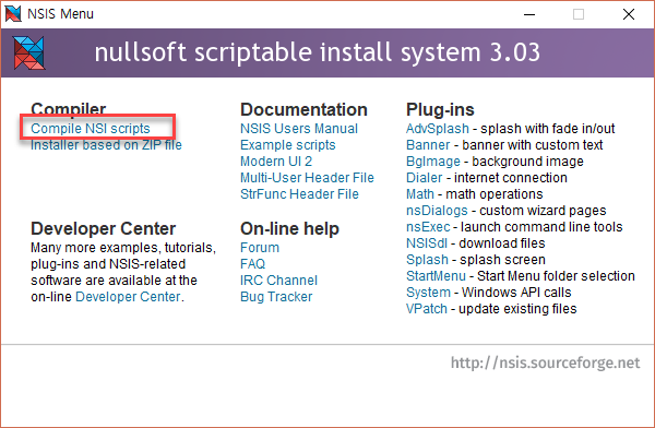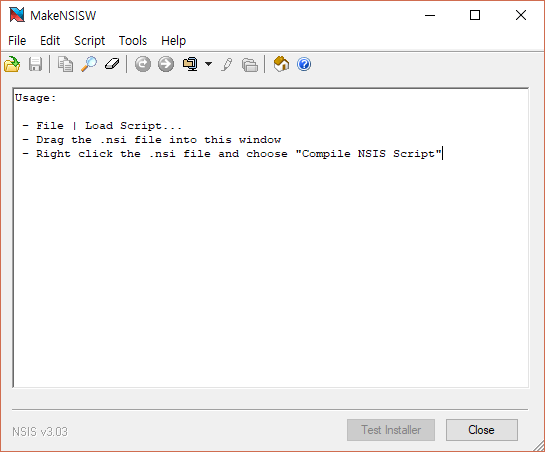 3-1. NSIS를 실행하여 Compile NSI script를 선택합니다. 그러면 MakeNSISW 창이 나타납니다.
