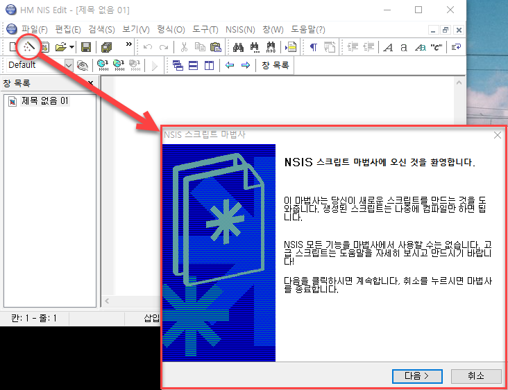 2-1. HM NIS EDIT를 실행한 뒤 NSIS 스크립트 마법사를 실행합니다.