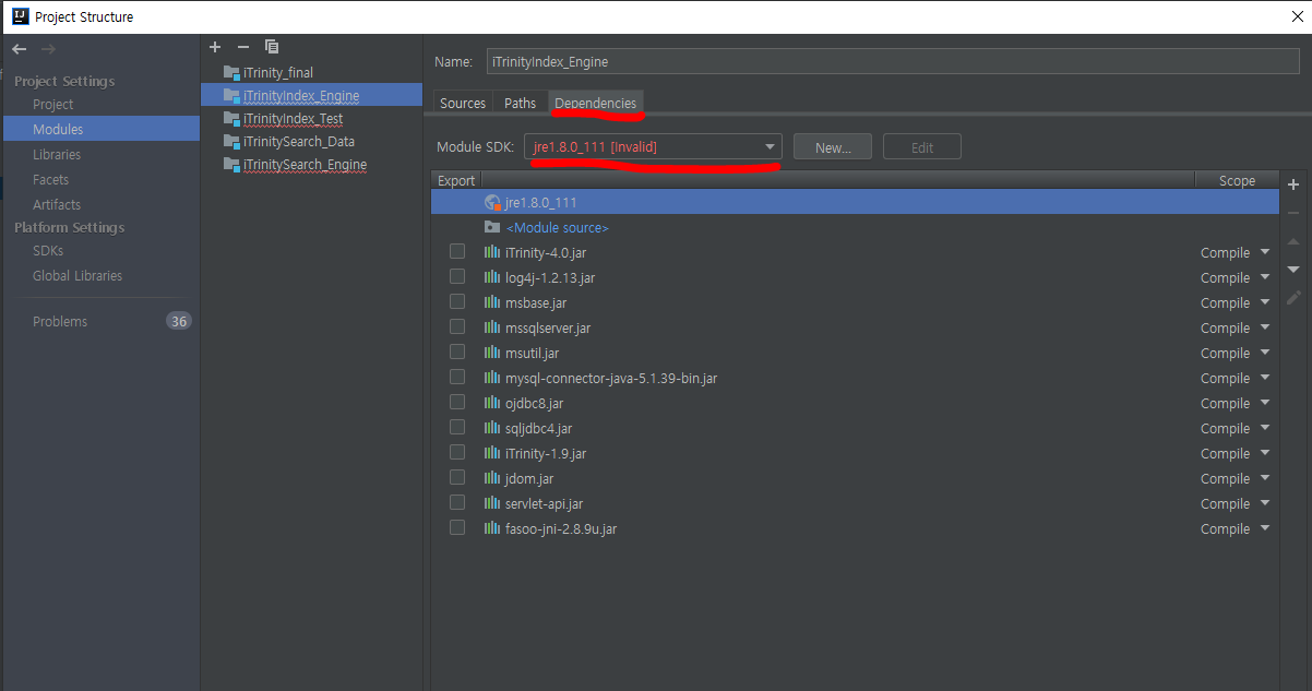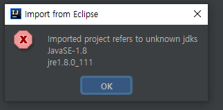 jdk를 참조할수 없다고 한다. eclipse 개발시 자바 버전과 현재 intellij에서의 자바버전이 맞지 않기 때문에 발생하는 에러이다. 이것은 모듈별로 하나하나 바꿔주면 된다.