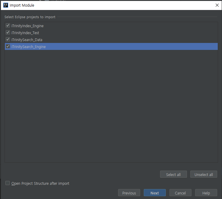import할 프로젝트를 선택하는 것이다. 여기서 최상위 프로젝트 하나만 선택하면 된다.