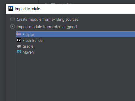 선택하게되면 어떤 모델의 프로젝트인지 골라야 하는데 당연히 나는 이클립스의 프로젝트를 가져오므로 이클립스를 선택하자.