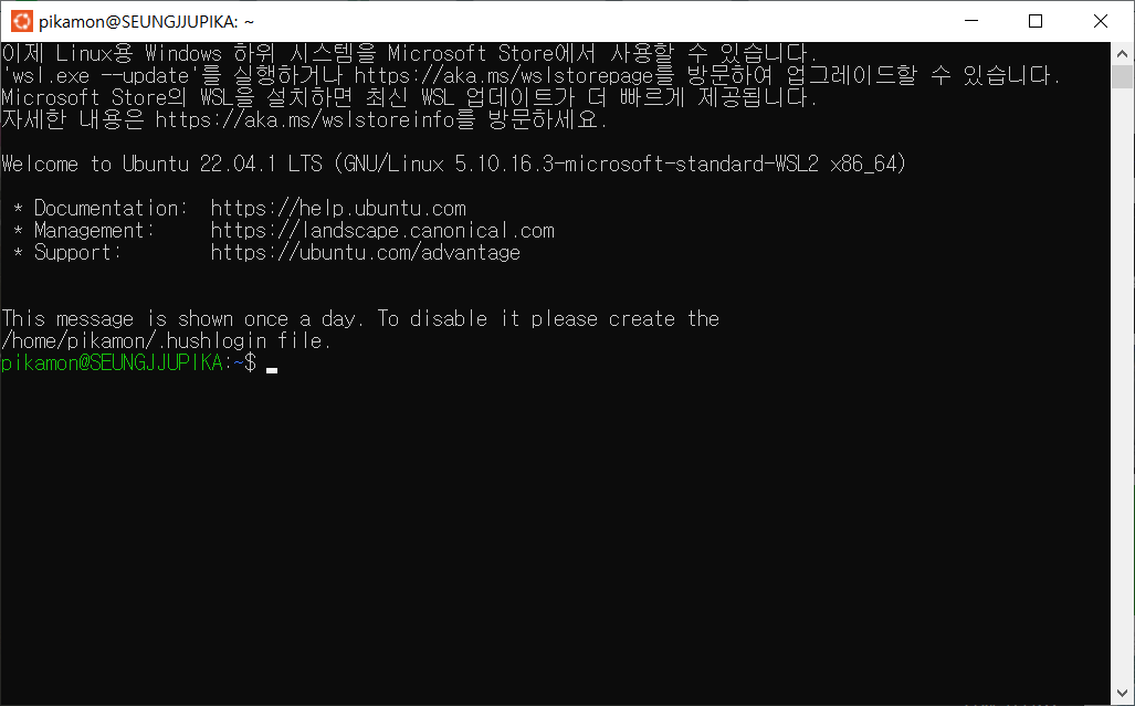 Ubuntu가 정상 실행되었다면 Ubuntu 콘솔에 아래와 같이 출력된다.