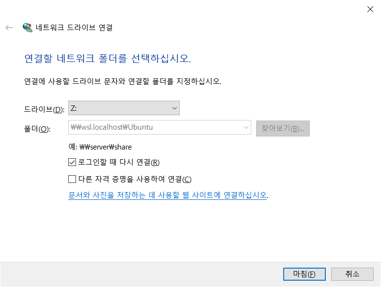 위 Ubuntu 폴더 오른쪽 클릭 후 "네트워크 드라이브 연결" 을 선택한다.