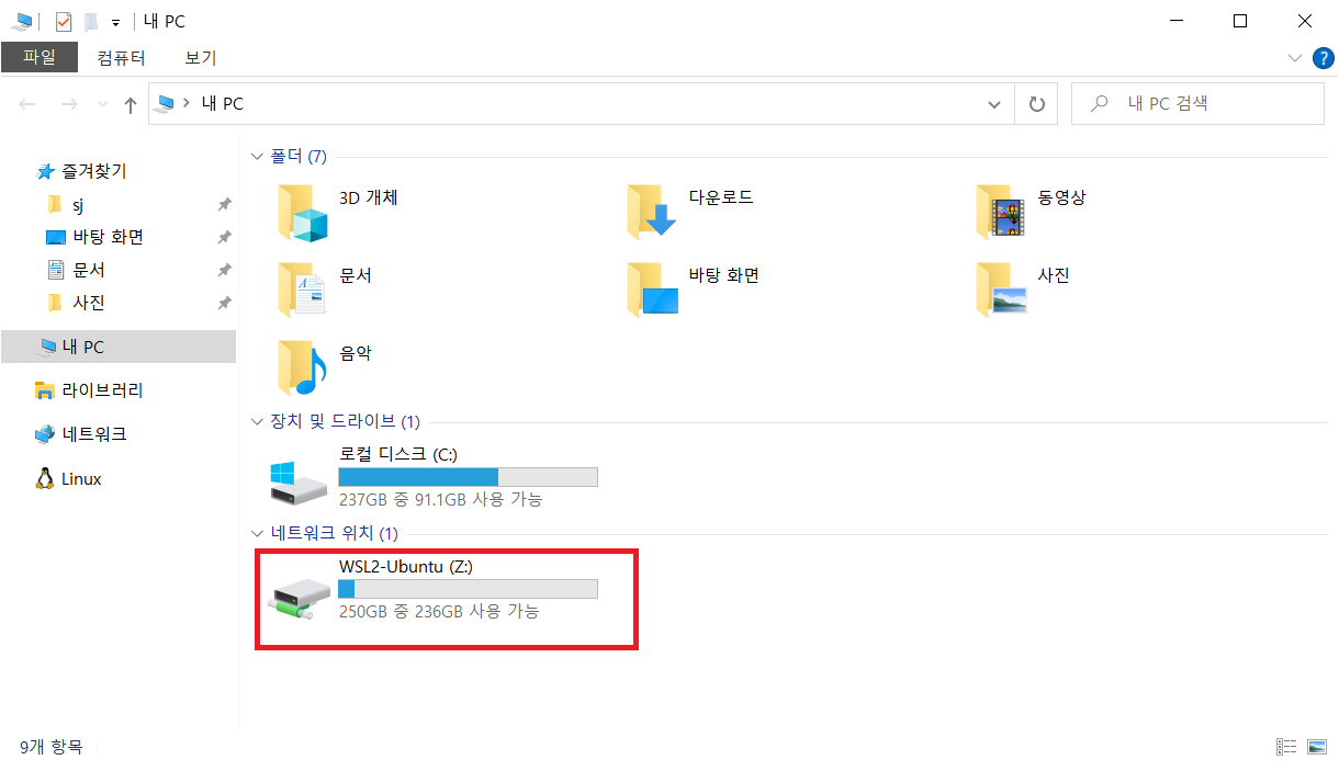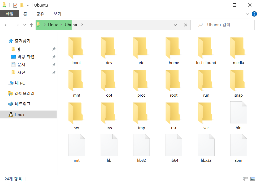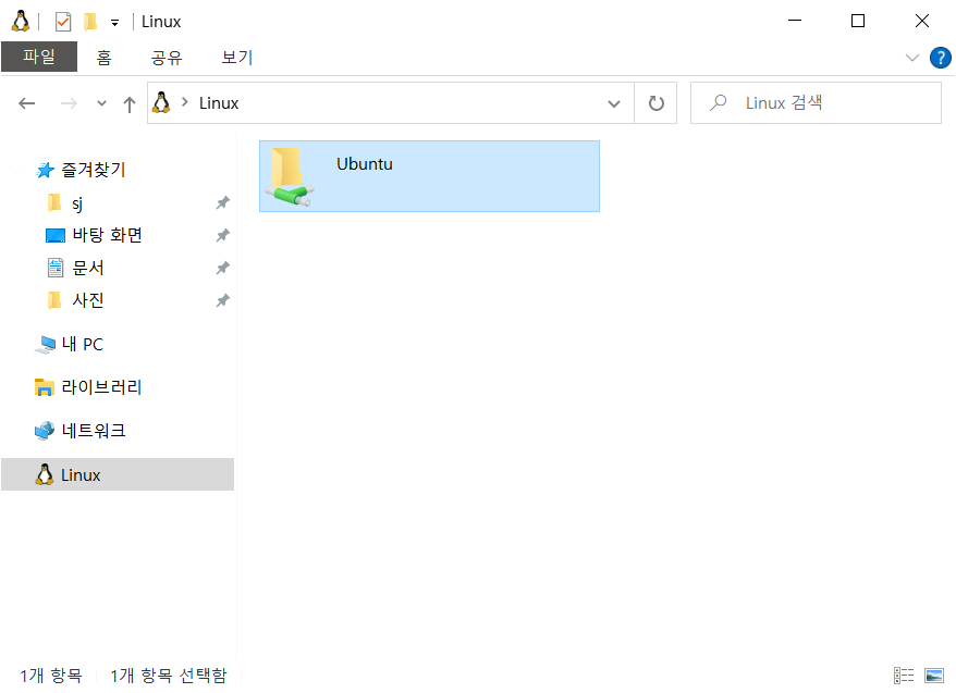 그러면 아래와 같이 Ubuntu란 이름으로 우분투 루트 디렉토리가 나오는 것을 볼 수 있다.